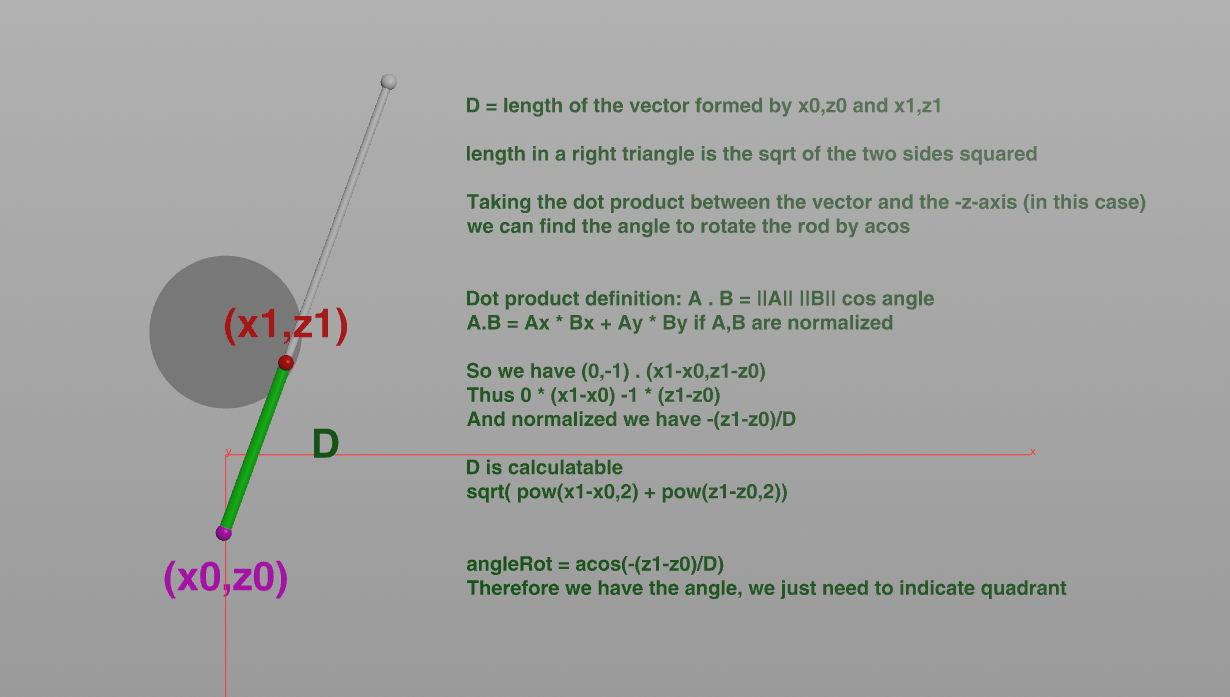 Here is an excellent example using the dot product, pythagorean theorem and a little bit of vector math tossed in to solve an animation problem. Please see the hip file to correspond to this.