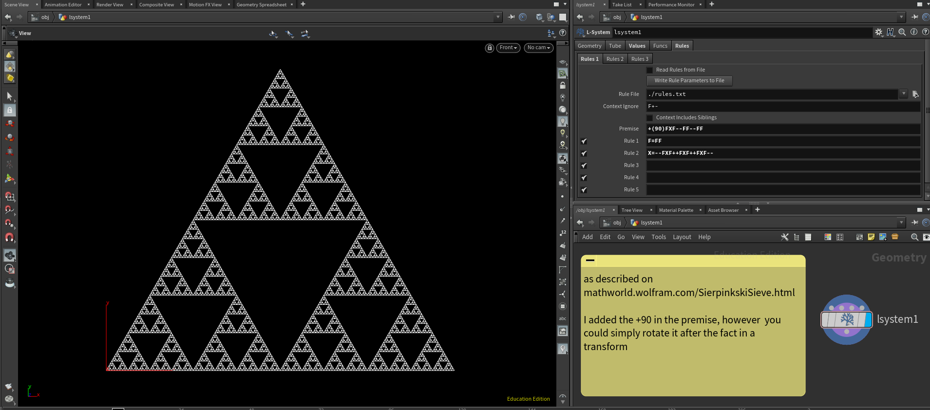 L-systems can be used for plant modeling and a variety of other uses. Below are two fractals produced in Houdini by expressing the premise and rules for their self similar pattern.