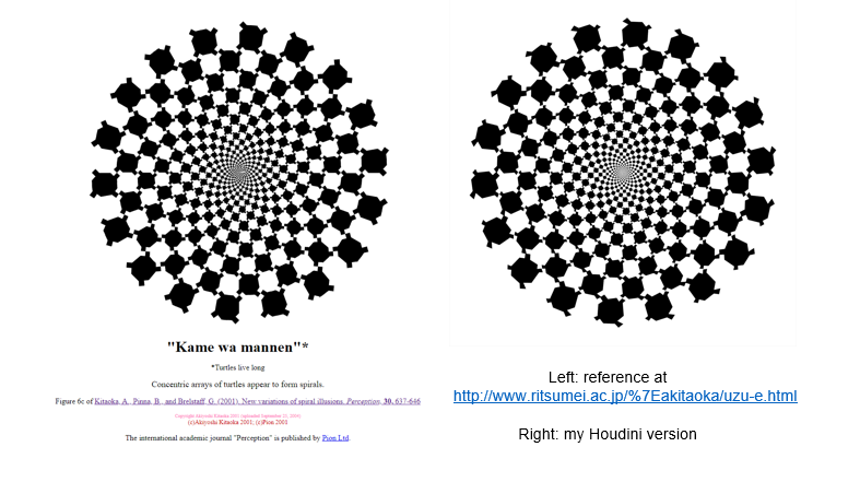 I recreated this pattern in Houdini. On the right is my RESULT. The illusion is named "Kame wa mannen" (Turtles live long). This also includes a link to a paper talking about spiral illusions. (https://www.ncbi.nlm.nih.gov/pubmed/11430247?dopt=Abstract)