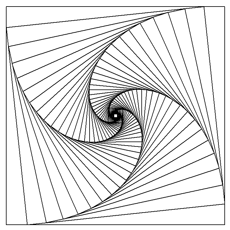 What is you were to use Python and Turtle Graphics? The same approach can be used. It is imperative that you use the shrinking rather than growing if you want filled squares as in turtle we are using a 2D tkinter window. Here are the same equations used in turtle graphics and python. The first one is 20 iterations, rotated 12.5 degrees and shrinking with pow(1/1.2,i). The second is 44 squares, rotation 6.05 degrees and scaling 1/1.1. The final one is with a smaller rotation, slower shrink rate and less rotation (70,1/1.05,3.125) and finally the same equation but iterating 20 times instead..