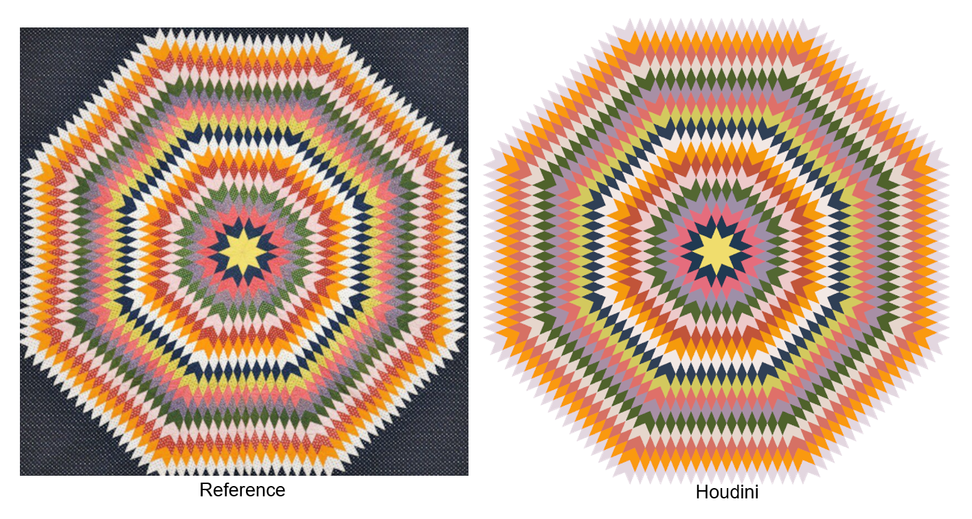 I recently came across this framed quilt in the Tucson Museum of Art. I thought it would be fun to try in Houdini and discovered both its mathematical principles as well as its organic structure that adds fascination.